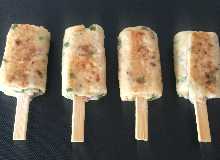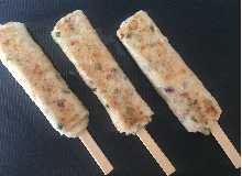 お好み焼きをシート状に延ばし、箸状の棒に巻きつけた祭事の屋台で人気のあるスティックタイプの『海鮮はし巻き』です。